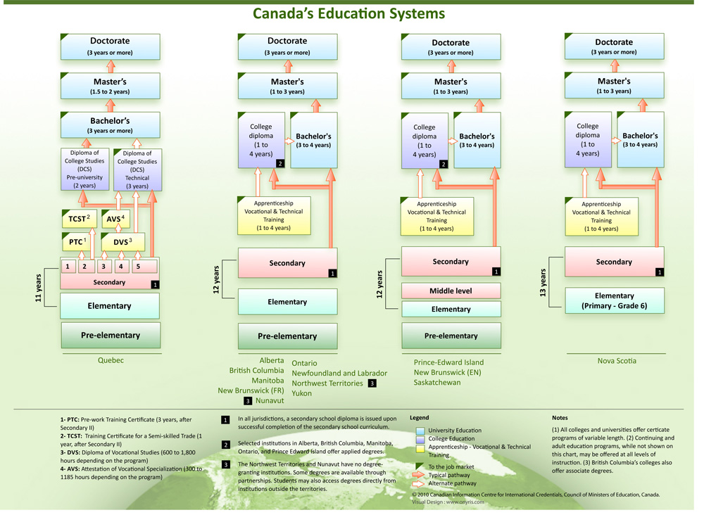 Система канадского образования отличается от известной нам тем, что в Канаде не существует единого федерального Министерства образования. Каждая провинция несет эксклюзивную ответственность в обеспечении населения возможностями получения начального, среднего и высшего образования в ее пределах, а также контроля над всеми его уровнями.